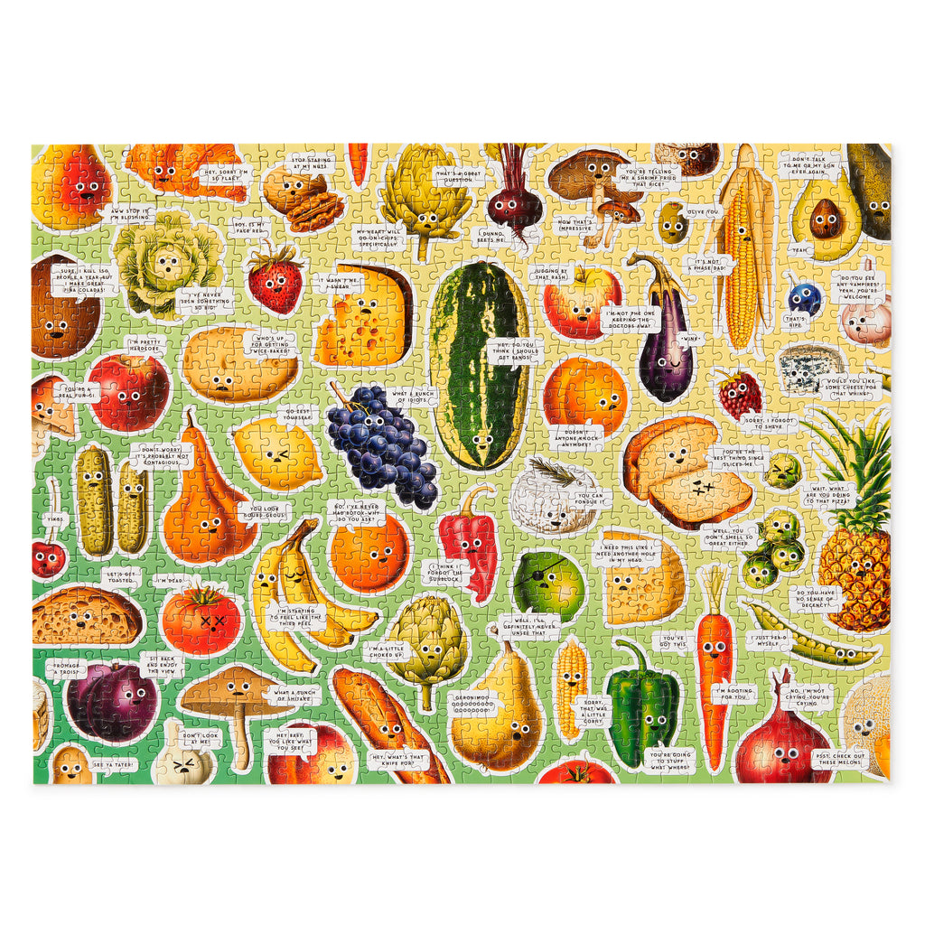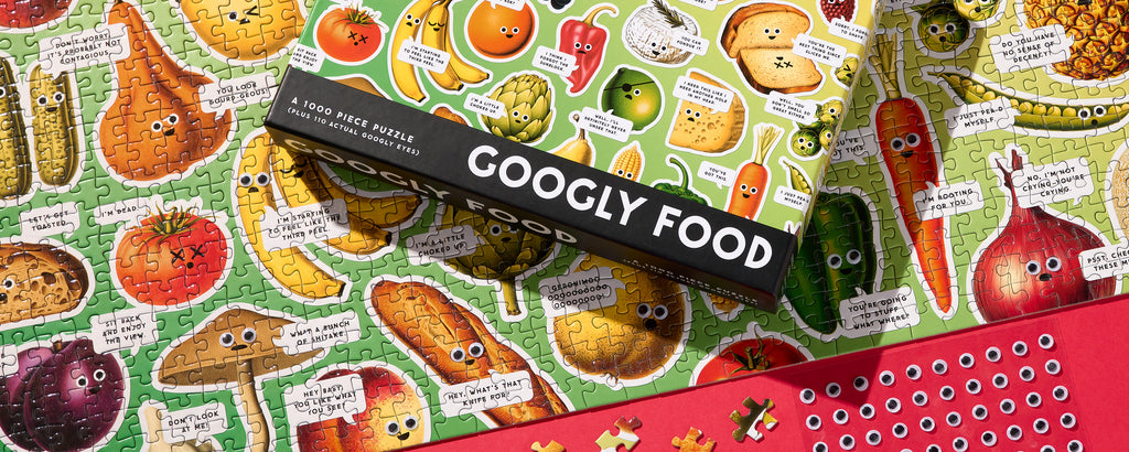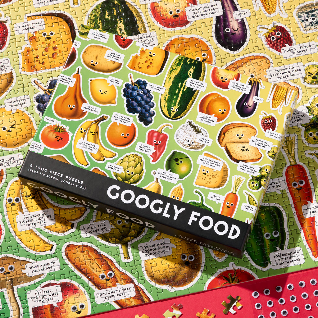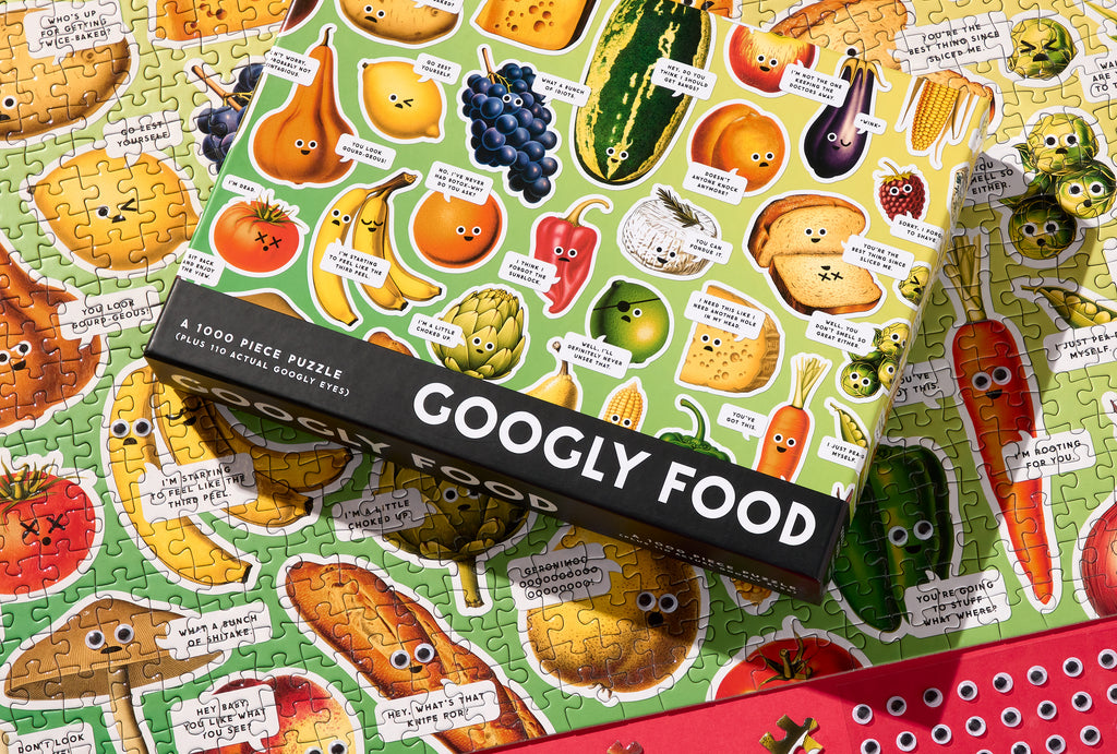 1000 PIECE PUZZLE – Finally, a 1,000-piece puzzle dedicated to the inner thoughts of food–and as it turns out, they’re kind of shocked. Thankfully, they’re here to do what you can't–adequately convey their wide-eyed disbelief about, well, pretty much everything. This spot UV puzzle (aka, there’s fancy shiny bits) has countless foods, each with their own quippy take on the world. Psst: As an added bonus, you’ll be able to enhance their googly-ness when you're done–thanks to the 110 included googly eyes.BRIGHT AND BOLD ARTWORK – This puzzle features a hilarious collage of all different kinds of foods fully equipped to sass you with their remarks. Puzzle lovers will appreciate all the interesting details as they piece together the puzzle, creating a wonderful display that will add charm and humor to any room.