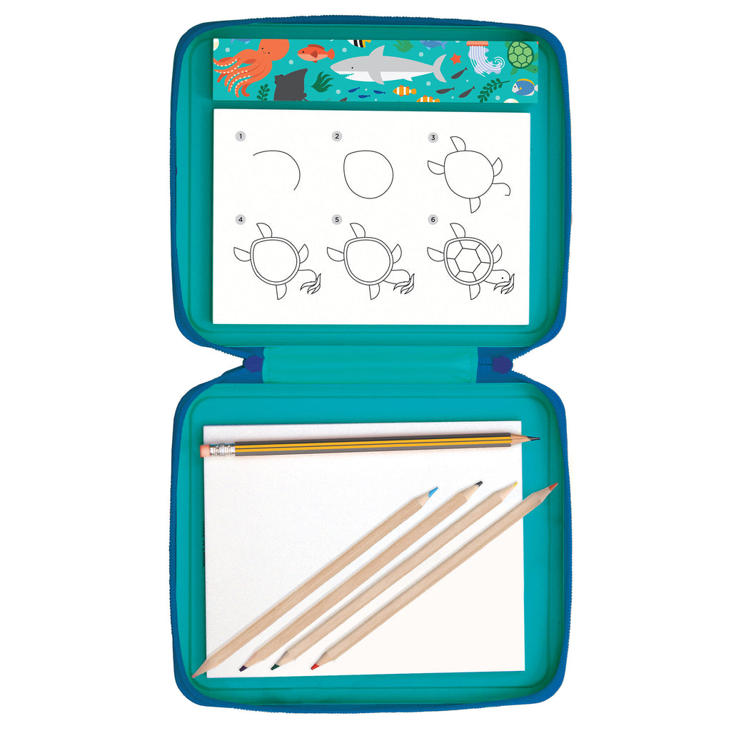 Perfect for ages 5+, the set includes instructions for drawing 36 different kinds of wildlife that live under the sea, a blank paper pad for your magnificent masterpieces, a lead pencil, and four double-ended coloring pencils—that’s eight colors! All the materials come packaged in a magnetic zip-up storage tin so your little one can make art on the move.