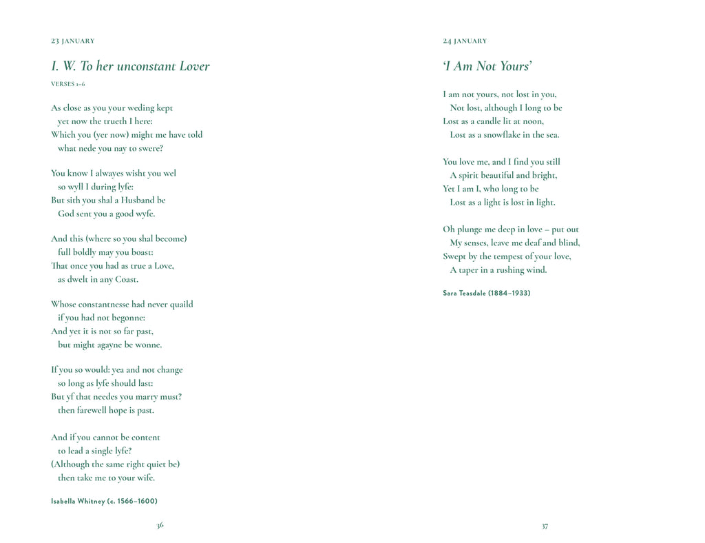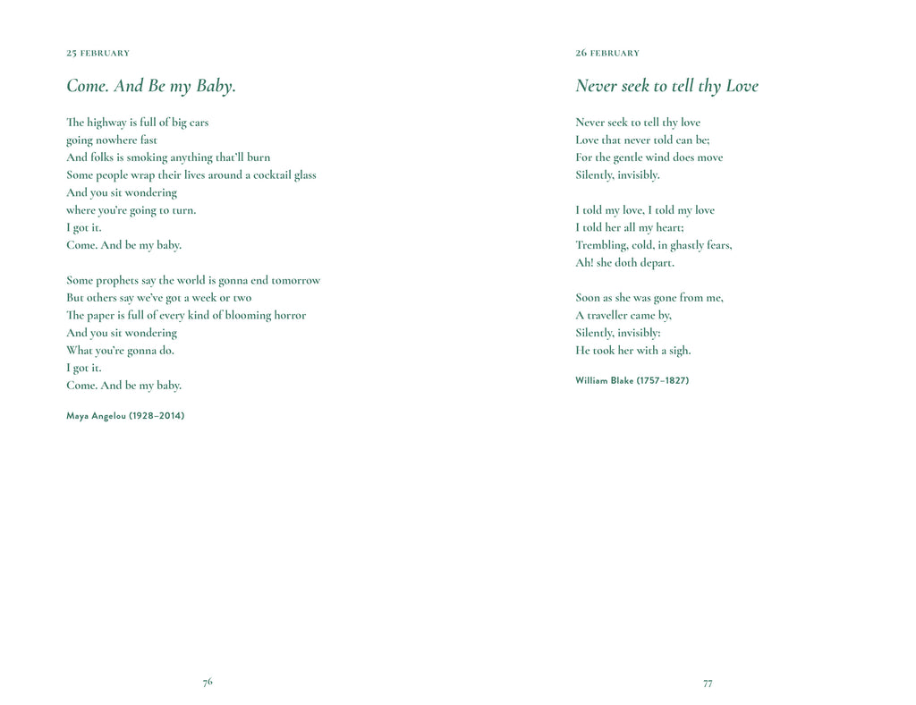 Among the 366 poems are Shakespeare's classic sonnets, Ocean Vuong's experiences of young queer love, Elizabeth Barrett Browning's ode to her dog, Charlotte Mew dealing with loss, and much, much more. With a wide range of voices spanning across the world through many centuries, this anthology explores how love can mean so many things and how it connects us all.