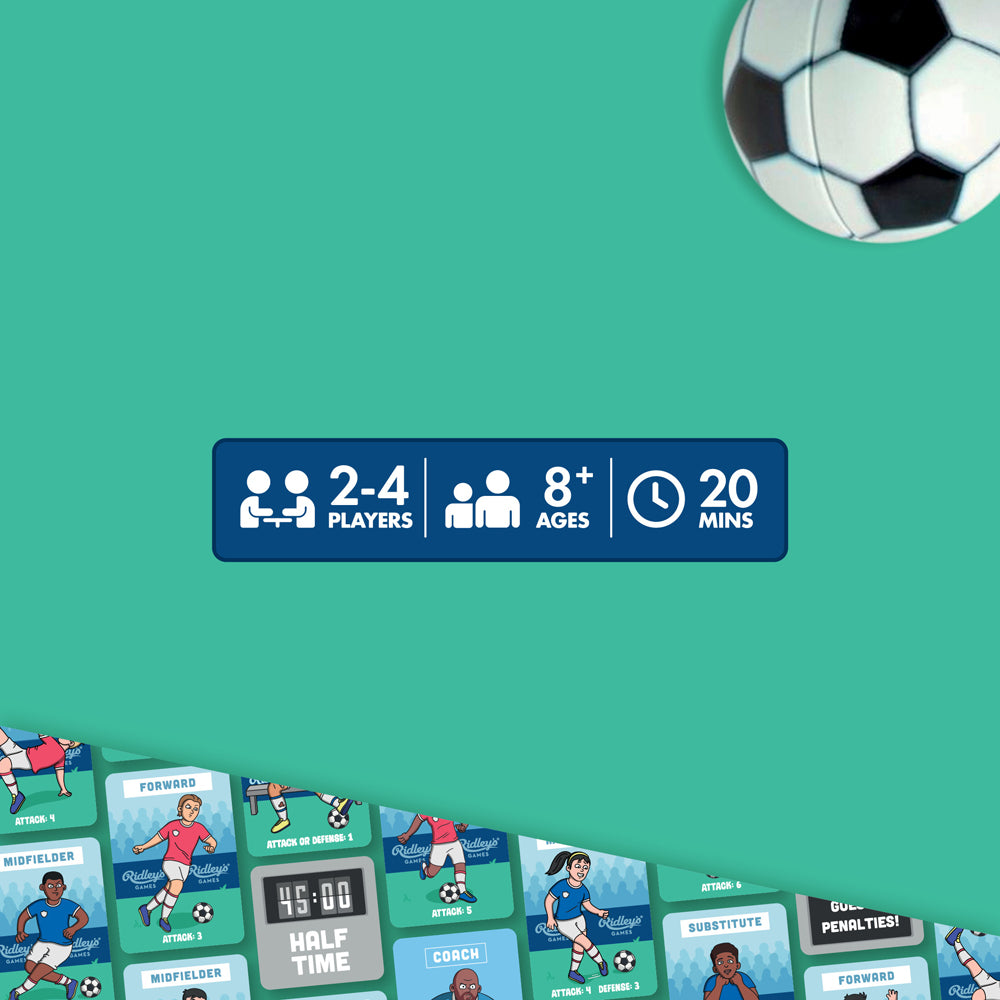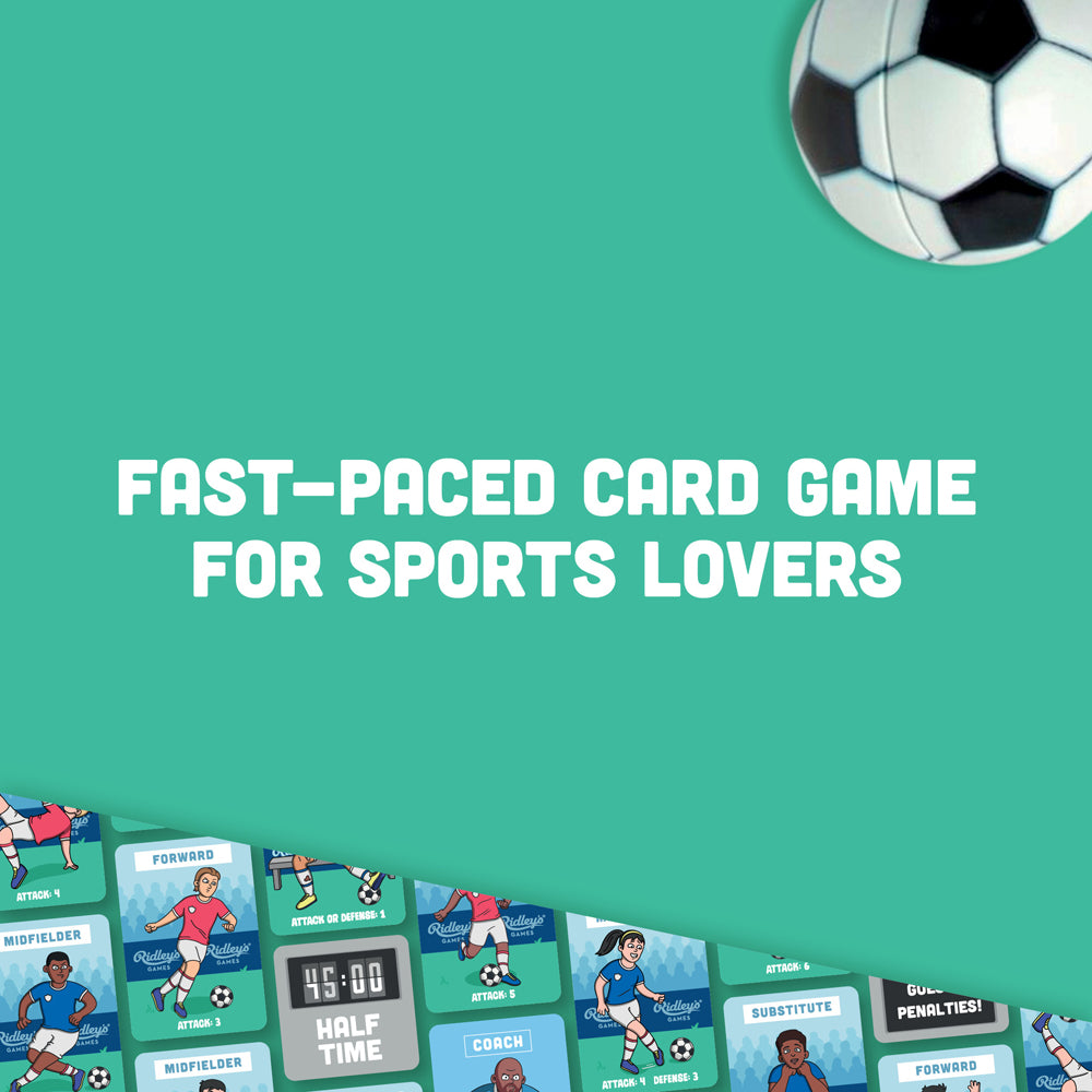 Kick off a league of fun with Kick It, the draft & score card game from Ridley's Games! In this fast-paced card game, players engage in offensive and defensive (Attack vs Defense) scenarios and try to finish each match with the most goals - but only one player's "team" can be victorious! There are two ways to play, in a League or Knockout tournament style, and each match consists of 6 rounds of multiple Attack vs Defense moves from each player involved in the match. The player who has scored the most goals when the Full Time whistle blows is the winner! In the event of a tie, play moves into the Penalty Shootout round to decide who is the ultimate champion. Perfect for families, football/soccer fans and non-sport fans alike, it's suitable for ages 8+, 2-4 players, and has an average 10-minute gameplay. Printed using FSC card and printed with soy inks.HOW TO PLAY: In this fast-paced card game, players engage in offensive and defensive (Attack vs Defense) scenarios and try to finish each match with the most goals - but only one player's "team" can be victorious! There are two ways to play, in a League or Knockout tournament style, and each match consists of 6 rounds of multiple Attack vs Defense moves from each player involved in the match. The player who has scored the most goals when the Full Time whistle blows is the winner! In the event of a tie, play moves into the Penalty Shootout round to decide who is the ultimate champion. WHO'S IT FOR: Perfect for families, football/soccer fans and non-sport fans alike. WHAT'S INSIDE: 36 player cards, 8 time cards, 4 coach cards, 4 subs cards, 2 penalty round cards, 18 goal tokens, and instructions.