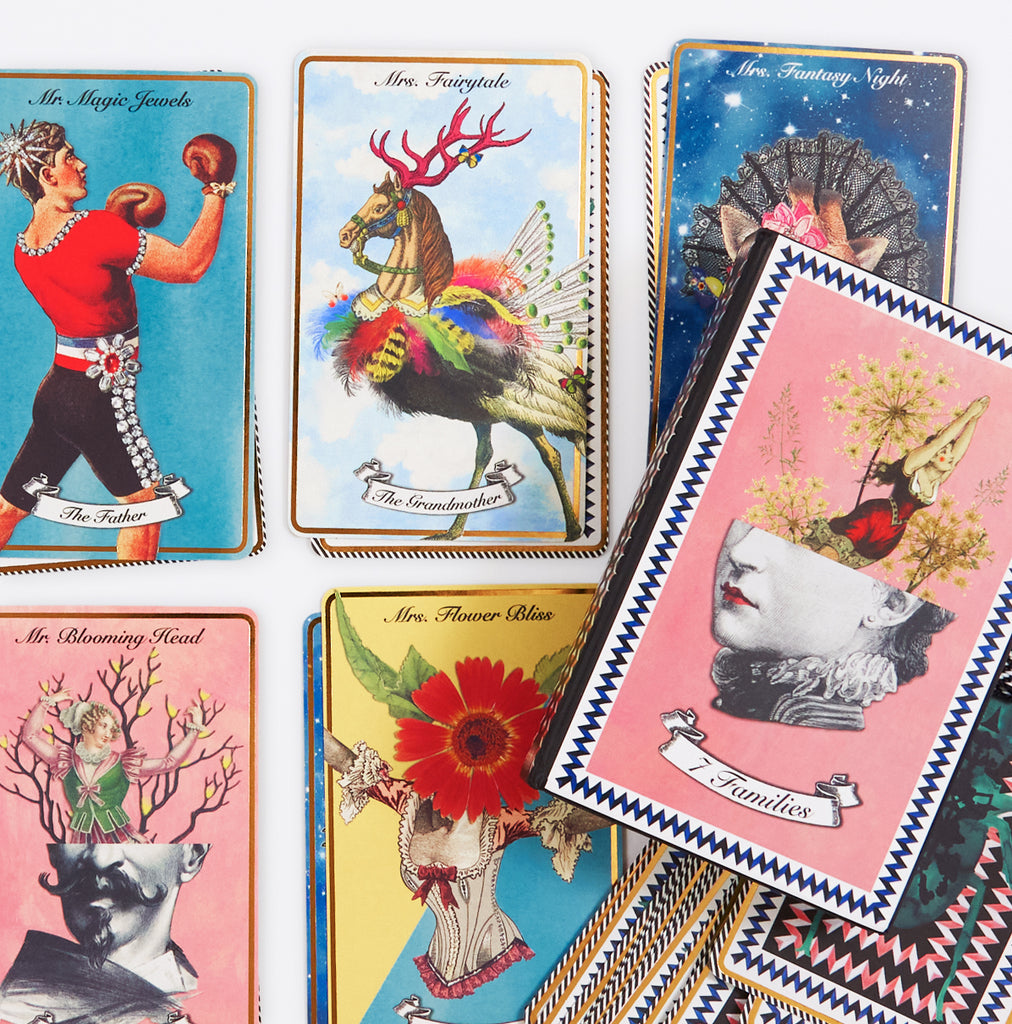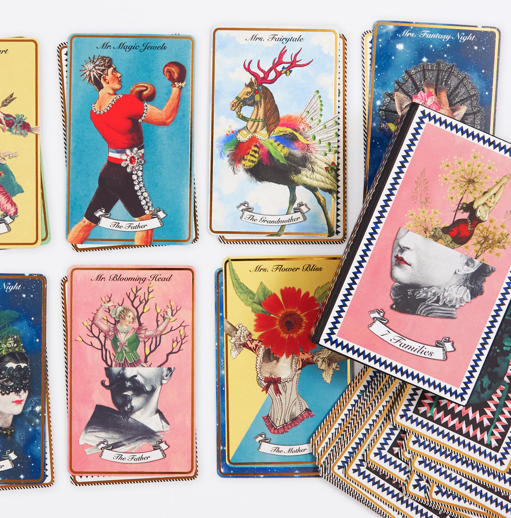 The Christian Lacroix 7 Families Card Game includes 42 exquisitely illustrated playing cards that make up 7 families, each comprised of 6 family members. Players take turns requesting additional members within the families they have been dealt. Once a player has a complete family, those 6 cards are displayed. The player who collects the most families wins!