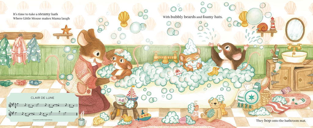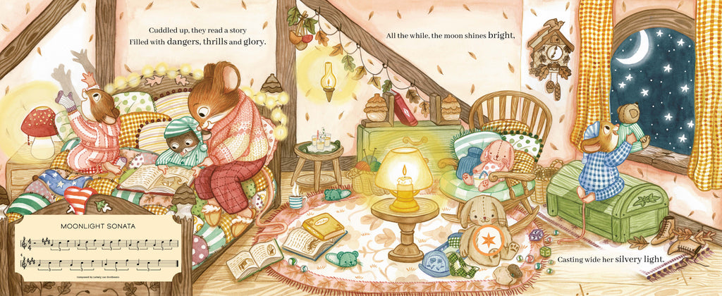 An interactive story book with eight musical clips, including "Moonlight Sonata" and "Clair de Lune".Get ready for bed with the Mouse Family as they take a bath, brush their teeth and read a bedtime story. Simply press the stars on the pages and drift off to sleep with these relaxing classical pieces: