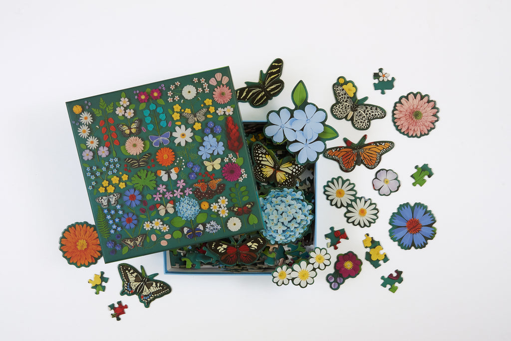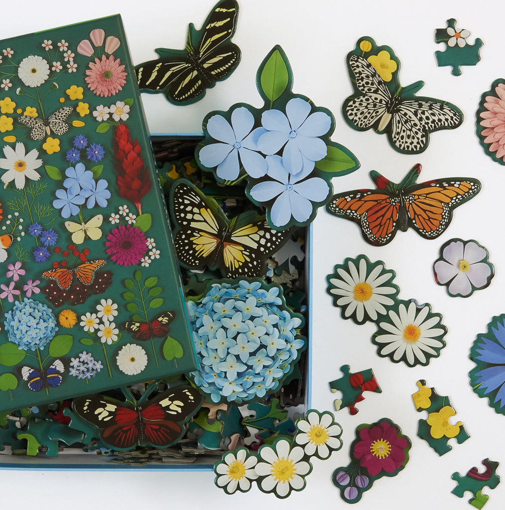 The Butterfly Botanica 500 Piece Puzzle features colorful illustrations of flowers and butterflies, including 15 shaped pieces. Galison puzzles are packaged in matte-finish sturdy boxes, perfect for gifting, reuse, and storage. An insert of the full puzzle image is also included.