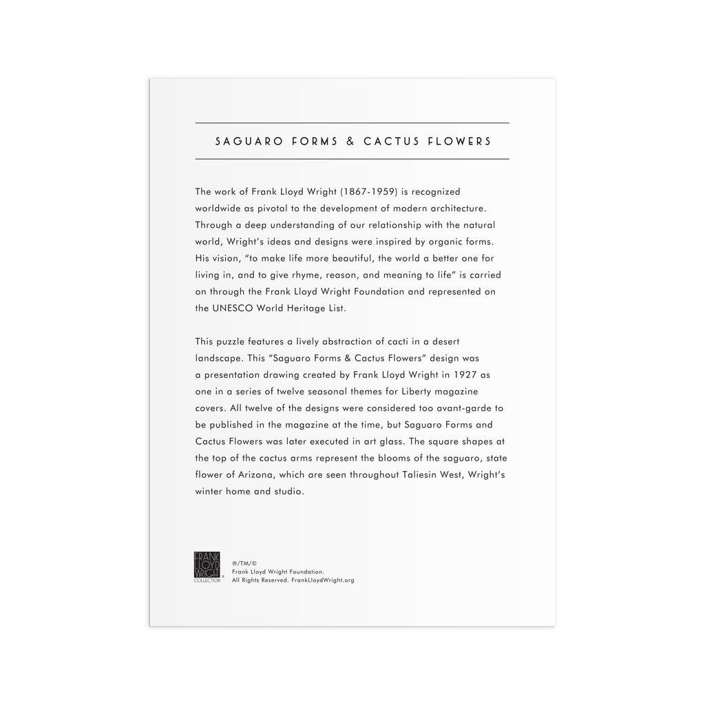 SHAPED FOIL DESIGN – Unlike traditional rectangular puzzles, this shaped design follows the organic flow of Wright’s Saguaro Cactus motif. The edges are beautifully contoured to echo the natural curves and architectural structure of the original artwork, giving the completed puzzle a one-of-a-kind silhouette. A full-color insert is included to guide puzzlers as they bring the intricate design to life.