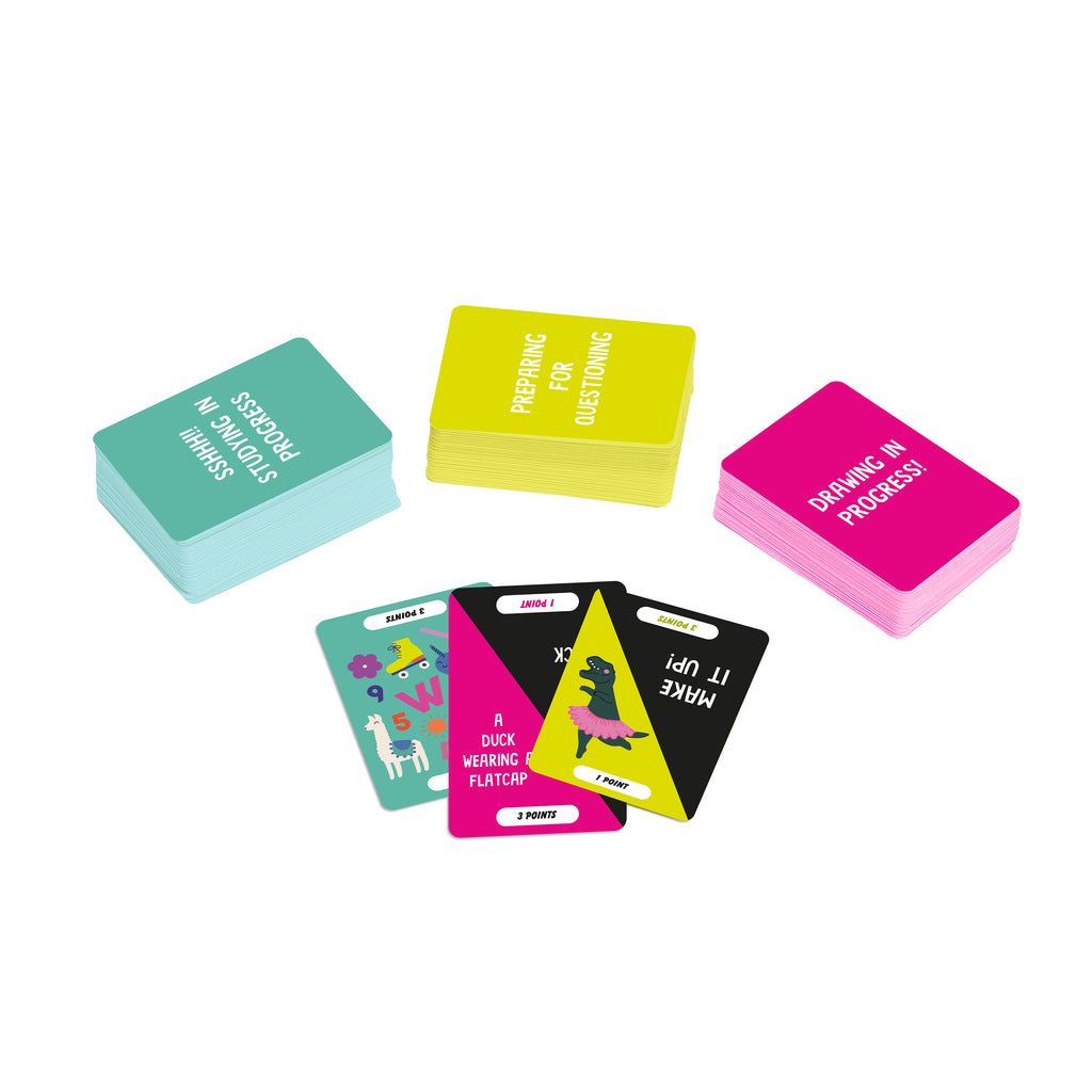 Roll the dice and take a category card that matches the color shown on the dice. Pink means it's time to test your artistic skills, and the player then needs to draw one of the two prompts (easy or hard) with all other players guessing what it is.