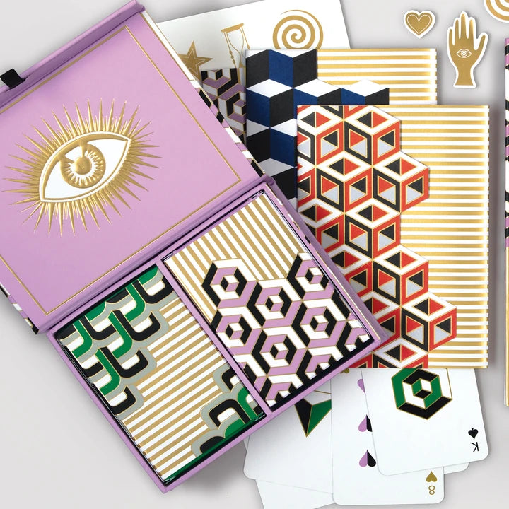 Jonathan Adler is a design company that creates luxe and livable interiors and chic products that are synonymous with modern American glamour. The Jonathan Adler Versailles Playing Cards set features Adler’s signature pattern dynamically deconstructed for a 21st century twist, classic-meets-cutting edge, treating graphic greatness to gobs of gold. The set includes two decks of gold foil stamped cards and a foil stamped box with ribbon pull and magnetic closure; makes a very chic gift.