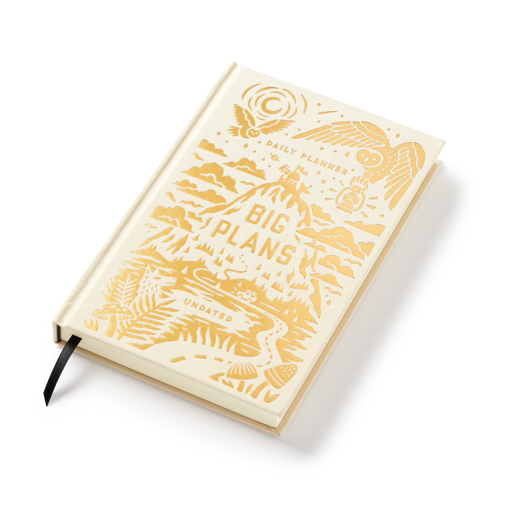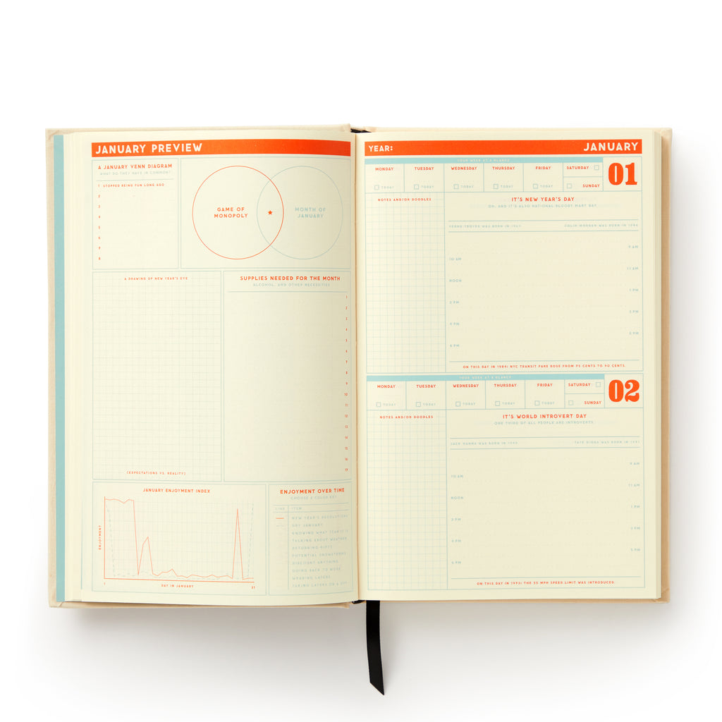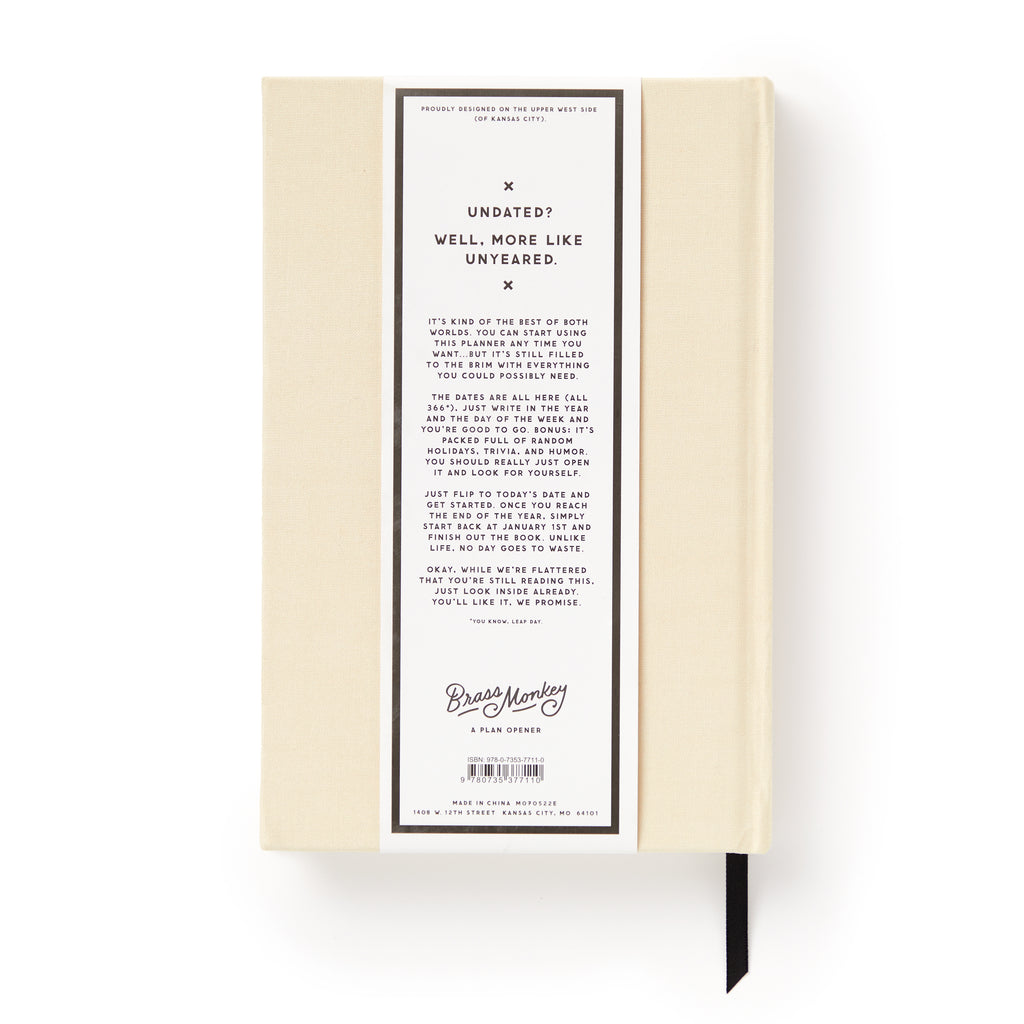 It's perfect for plotting out all of your important life goals–like the taco places you need to try before you die. Sure, this vintage-inspired, cloth-bound daily planner by Brass Monkey is technically undated...but that's really selling it short. It's more like...'un-yeared.' See, we did all of the hard work for you. We've already put in all the dates, the fixed holidays, and tons of extra stuff like daily random holidays (like House Plant Appreciation Day, just for an example), celebrity birthdays, and other bits of trivia. With knowledge like this, you'll be the life of the party that you probably didn't want to go to in the first place. All you have to do is fill in the year and what day of the week each day is on. Simple. So if you want, you can buy this planner today and still procrastinate actually using it until 2054...live your life. • Inspired by vintage library books. You remember what those are, right? • Features a cloth-bound cover with embossed, gold foil artwork covering the whole...well, cover. • Comes pre-filled with 366 days (336 pages) of random holidays, trivia, and humor. • Includes an attached black satin bookmark to help you pick up where you left off. • The book measures 6" wide by 9" tall (and .9" thick)–that's 152mm by 229mm if you're fancy. • Psst: this is a full-sized counterpart of our mini-planners.
