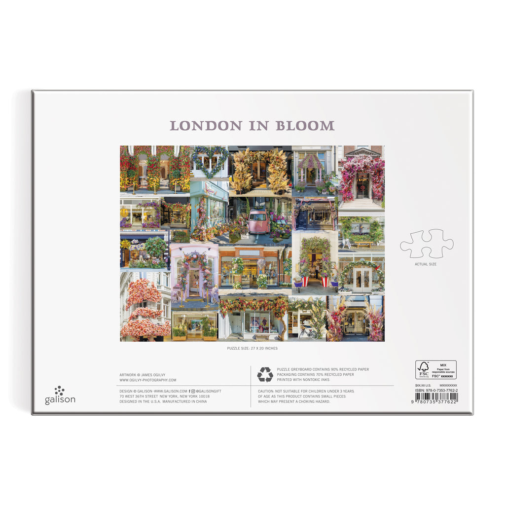 The London in Bloom 1000 Piece Puzzle from Galison showcases the city of London wrapped in florals and trees for a beautiful and challenging puzzle experience. Galison puzzles are packaged in matte-finish sturdy boxes, perfect for gifting, reuse, and storage.