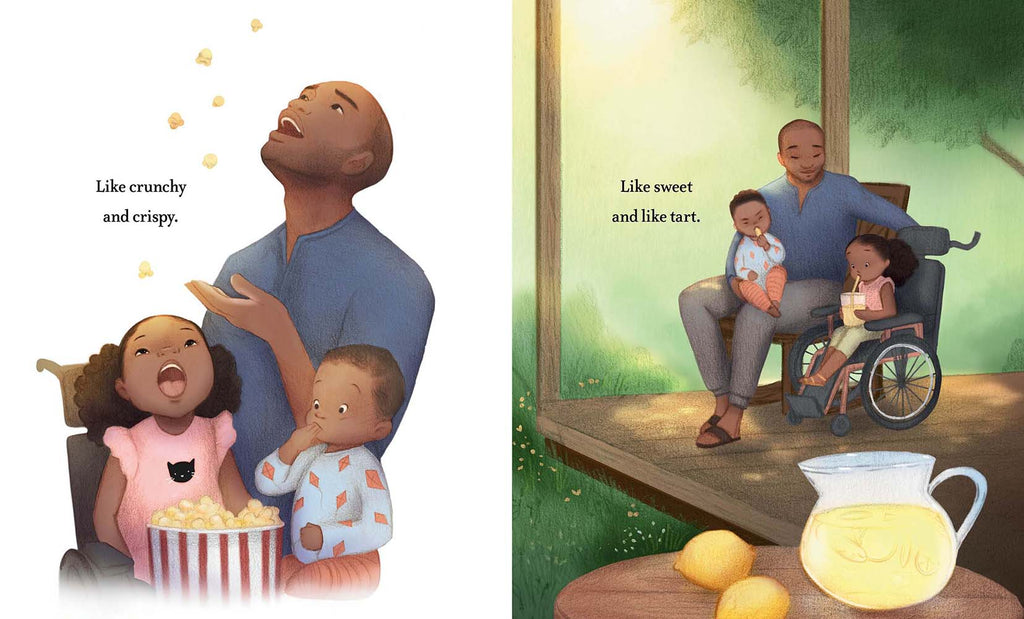 Love comes in many forms. It can feel tart as lemonade, or sweet as sugar cookies. Slow as a lazy morning, or fast as a relay race. Love is there through it all: the large and small moments, the good times and bad. And at the end of the day, love settles us down to bed with a hug and kiss goodnight.