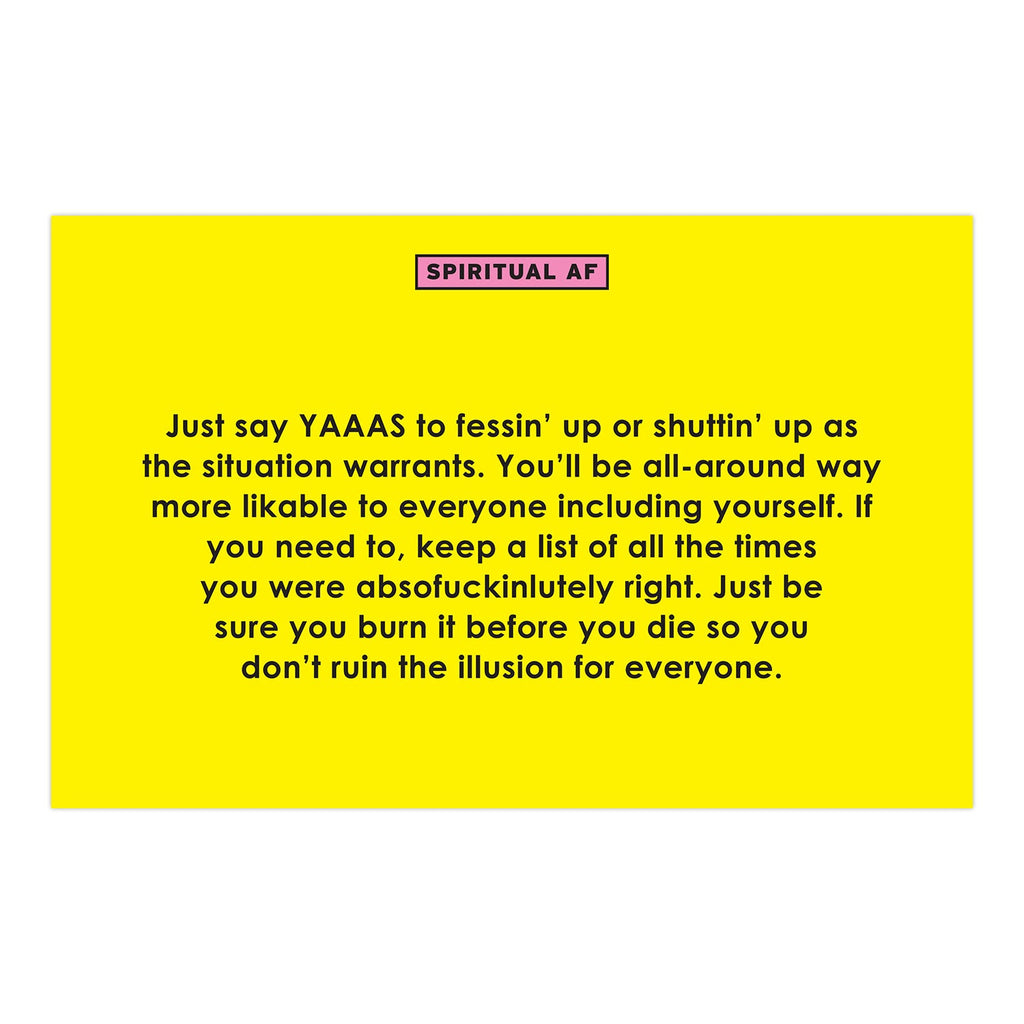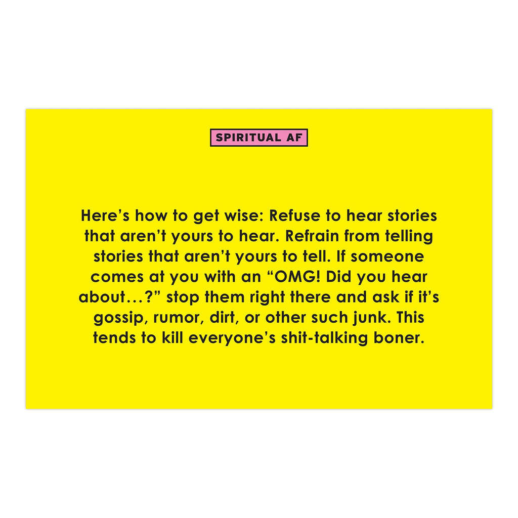 These super-salty, ultra-inspiring cards don't sugarcoat that it's often hard AF to grow as a human and be your best self. Use this deck to help you put feet on your spiritual practice. Simply pick a card, read it, do what it says, then see your life get less shitty. It's spiritual growth in a box!