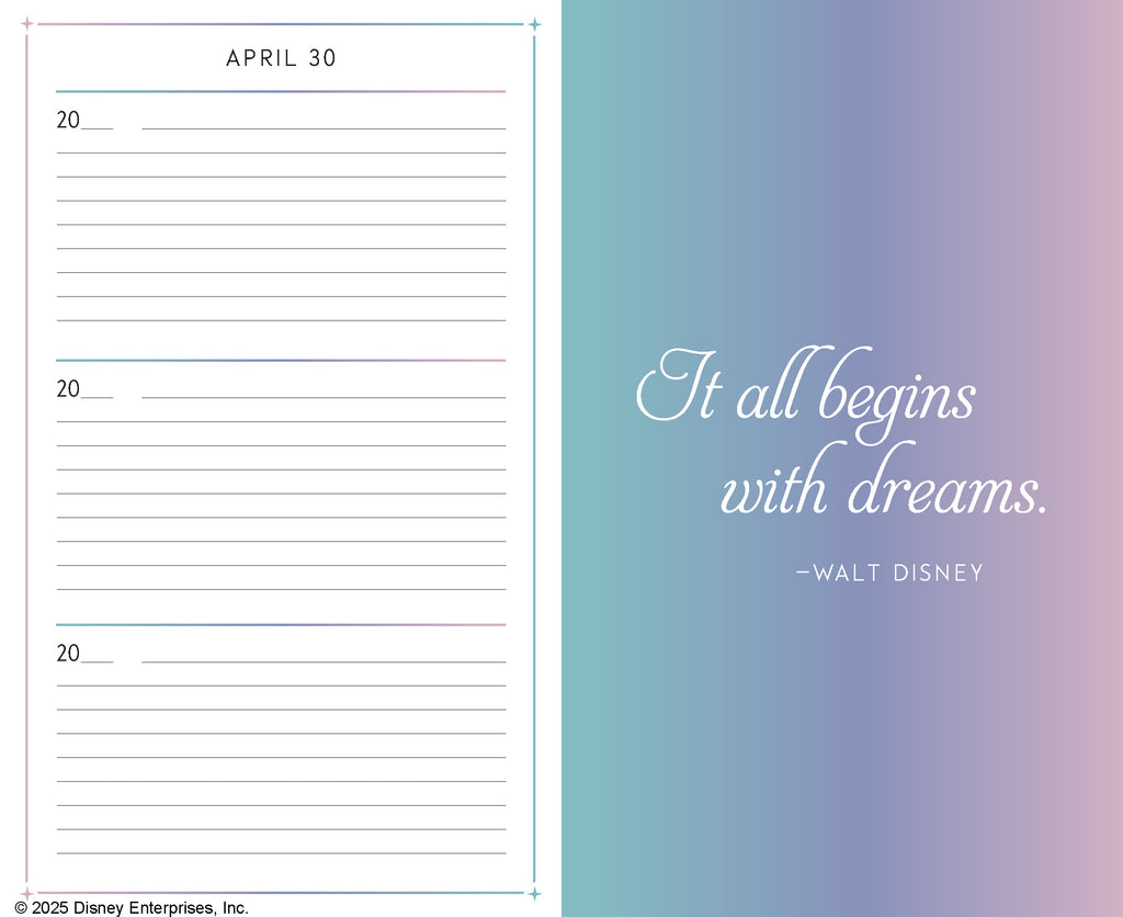 The bestselling One Line a Day journal series has sold over 3.5 million copies! Inspired by classic Disney magic, this eye-catching rendition of the classic memory-keeper shines as bright as a wishing star.This keepsake journal invites you to capture your wishes over three years. As you write, the layout allows you to see your wishes, dreams, and reflections on the same date in previous years. Uniquely rewarding, simple to complete, and presented in a stunning package, this beautiful journal will become a treasure trove of wishes and dreams to cherish forever.