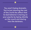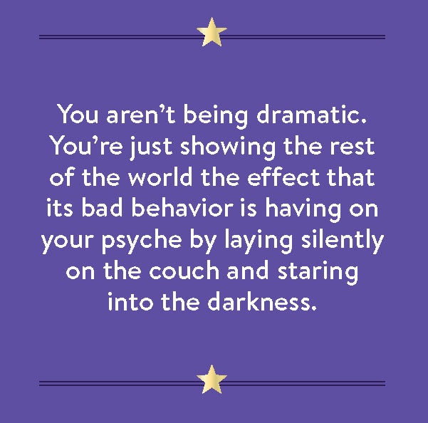 - You aren’t being dramatic. You’re just showing the rest of the world the effect that its bad behavior is having on your psyche by laying silently on the couch and staring into the darkness.