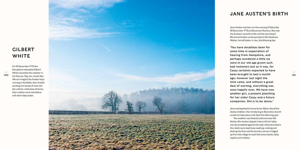 Arranged over the course of a calendar year, from snowy scenes in January to festive recipes in December, specially commissioned photography of Austen’s home and possessions are brought together with extracts from her books, reproductions of her letters, and stories of her life throughout the seasons. Highlights include affectionate letters to her sister Cassandra, the story of the publication of the first edition of Pride and Prejudice, and the 'topaze crosses' that inspired Mansfield Park.