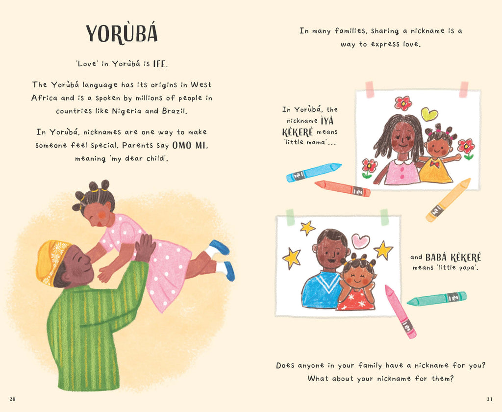 Journey around the world in this beautiful exploration of language that invites little learners into the many wonderful ways to say, share and show love. This delightful pocket-size book offers 100 loving words or phrases and its meaning, along with a tradition or activity related to each culture, beautifully illustrated by Instagram star Annelies Draws.